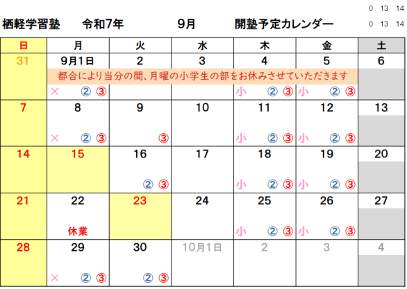 19日をお休みにして26日に振り替えます。小…小学生、①…中1生、②…中2生、③…中3生